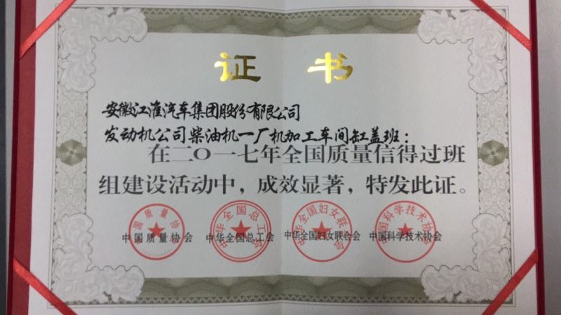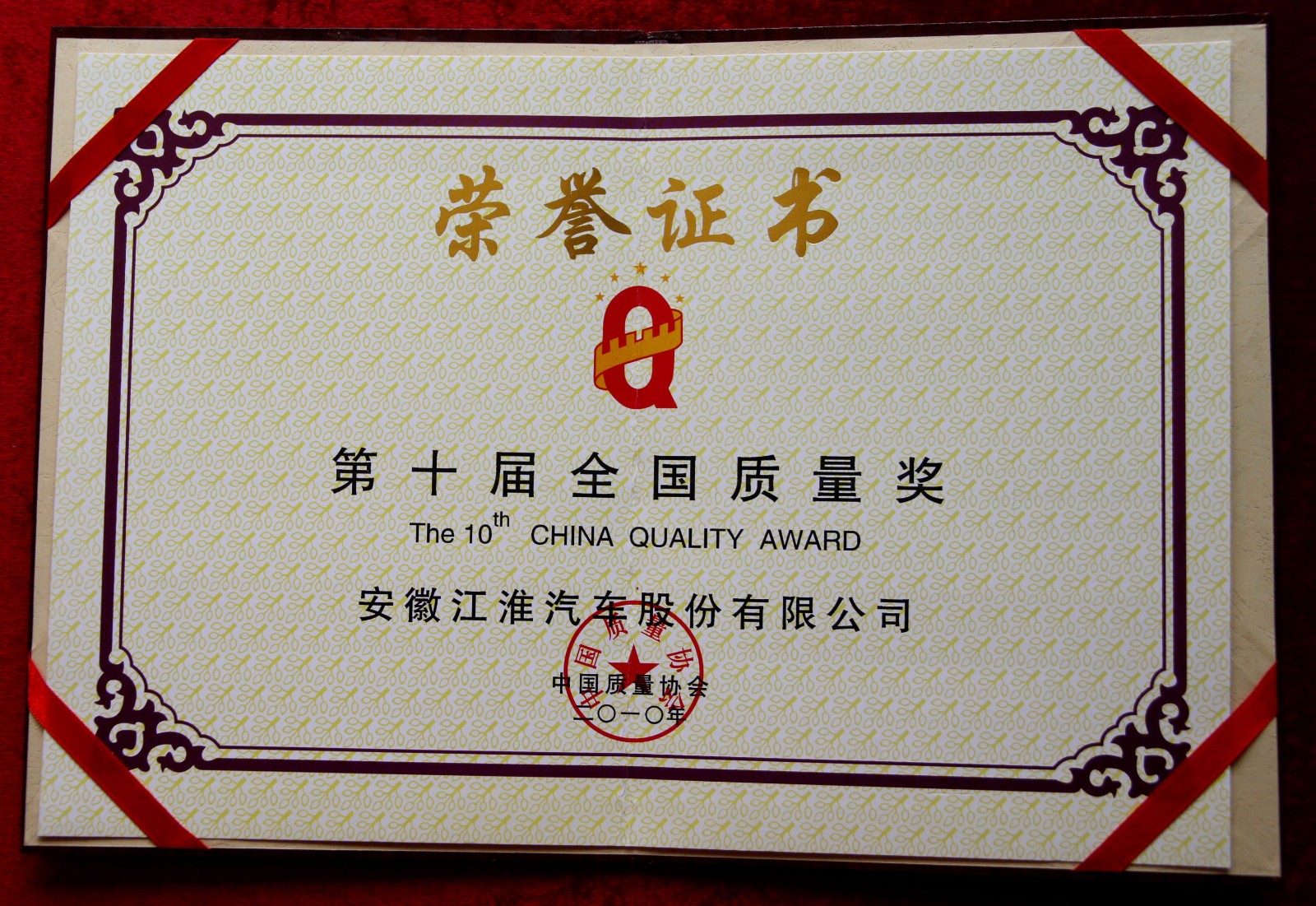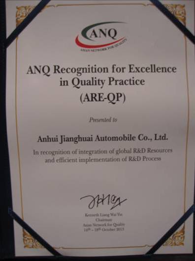 公司始終將質量視為企業生存發展之本,先后通過ISO9001質量管理體系,環境管理體系、職業健康管理體系、ISO/TS16949質量管理體系認證。因在質量管理領域的卓越成就,公司2010年榮膺中國質量管理領域最高獎項——全國質量獎,成為唯一獲得此獎項的中國品牌車企。2012年榮獲出口免驗企業,成功樹立國際知名品牌形象。