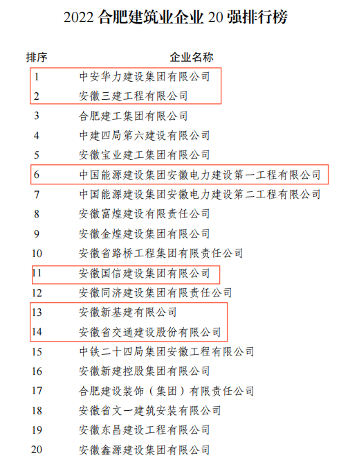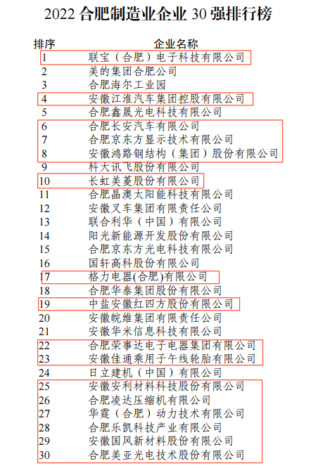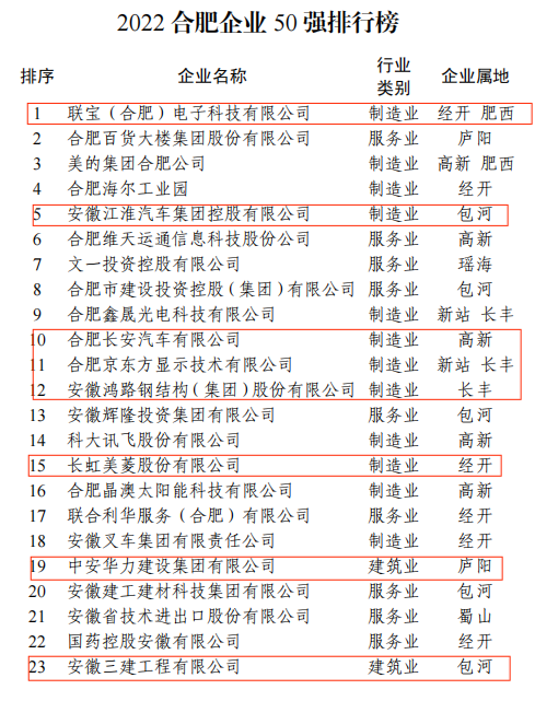 12月8日,2022合肥企業50強、合肥制造業企業30強、合肥服務業企業20強、合肥建筑業企業20強、合肥農業企業20強(排序以2021年度營業收入為準)正式發布。其中,我會會員企業中共有16家進入合肥企業50強名單,16家進入合肥制造業企業30強、1家進入合肥服務業企業20強、6家進入合肥建筑業企業20強、3家進入合肥農業企業20強!完整名單如下: